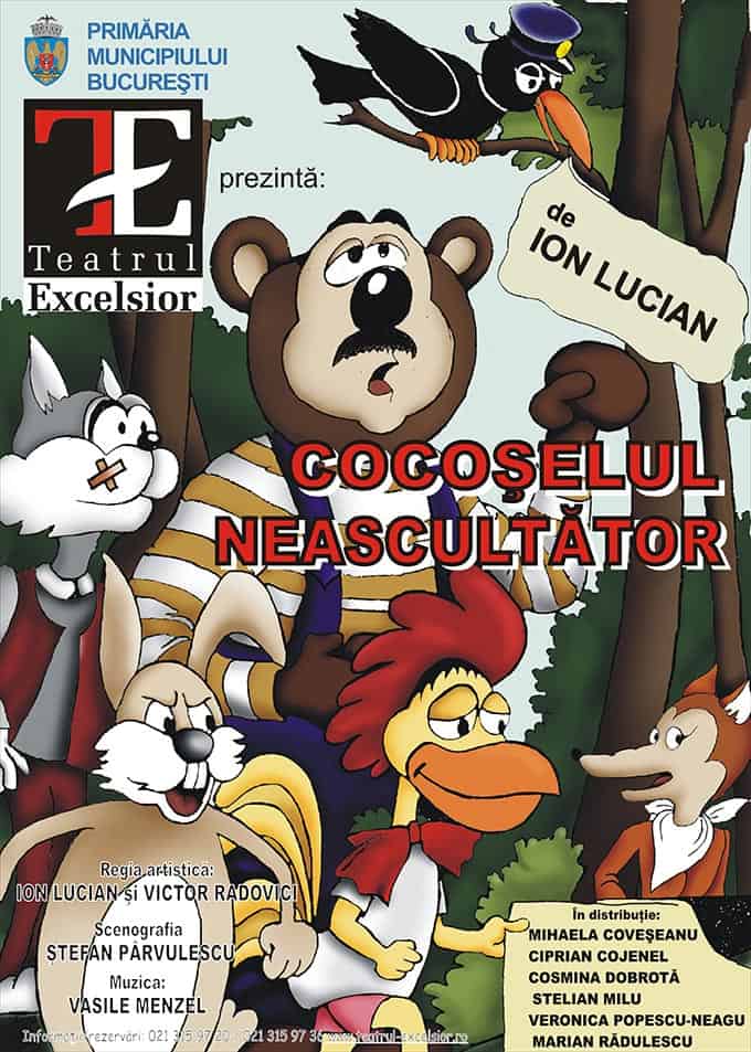 Spectacolul Cocoşelul neascultător urmăreşte povestea a trei prieteni – Cocoşelul, Ursuleţul şi Motănelul, pe măsură ce se confruntă cu uneltirile Vulpoiului. Deşi este avertizat de lăcomia acestuia, când rămâne singur, Cocoşelul uită sfaturile prietenilor săi şi îi cade în capcană Vulpoiului. Ursuleţul şi Motănelul, împreună cu celelalte personaje, pornesc în ajutorul Cocoşelului, zădărnicind în final planul de răzbunare al Vulpoiului. Spectacolul ilustrează atât pericolul la care sunt supuşi cei care se lasă pradă propriilor slăbiciuni, cât şi puterea iertării şi a prieteniei de a transforma obstacolele în lecţii despre responsabilitatea fiecăruia pentru faptele sale.