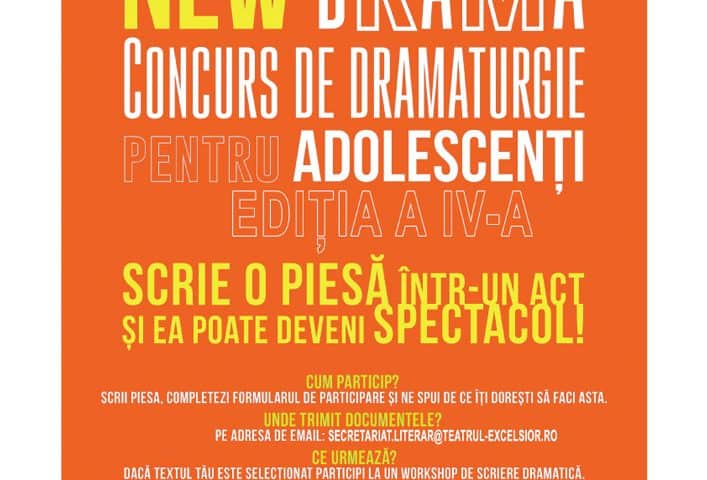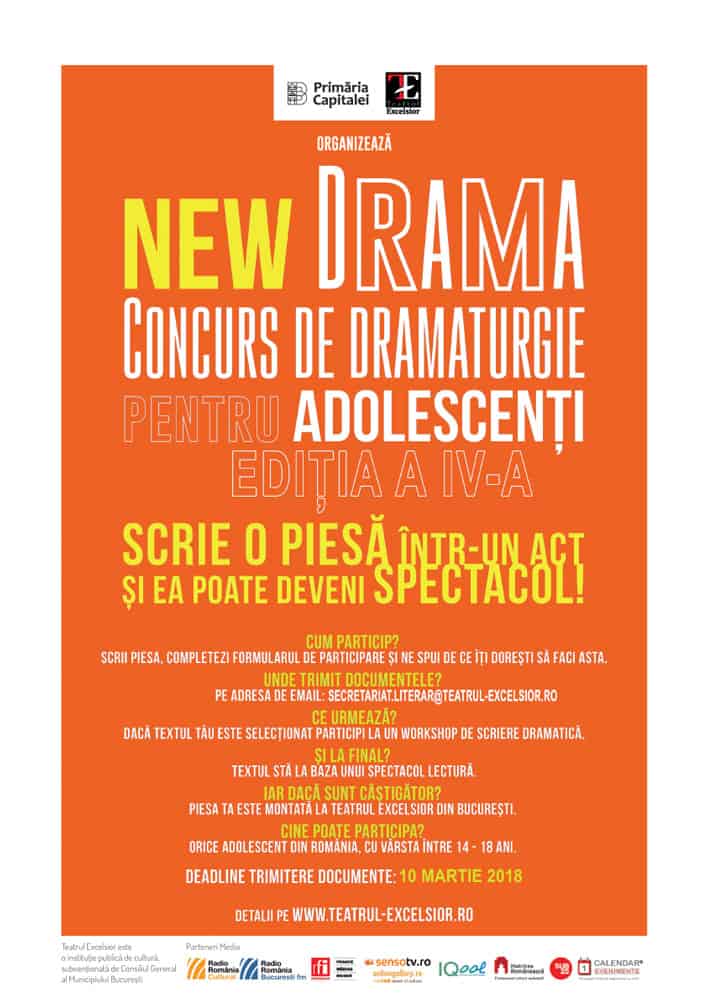 Cea de-a IV-a ediție a Concursului de dramaturgie pentru adolescenți NEW DRAMA se va desfășura în ianuarie-iunie 2018. Concursul, organizat de Primăria Capitalei prin Teatrul Excelsior, se adresează adolescenților cu vârsta cuprinsă între 14 și 18 ani, pasionați de teatru. Ei sunt încurajați, astfel, să își dezvolte imaginația prin însușirea tehnicilor de scriere dramatică. Trebuie să scrie o piesă într-un act și să o trimită pe adresa online (secretariat.literar@excelsior.info.ro), împreună cu o scrisoare de motivație, prin care să explice de ce își doresc să participe la acest concurs. Proiect realizat cu sprijinul Ministerului Educației Naționale.