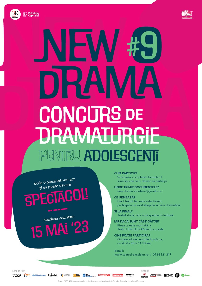 Teatrul EXCELSIOR lansează cea de-a noua ediție a Concursului de dramaturgie NEW DRAMA, un proiect dedicat tinerilor cu vârste cuprinse între 14 și 18 ani, care sunt încurajați să își dezvolte imaginația prin însușirea și dezvoltarea tehnicilor de scriere dramatică. Acest demers cu tradiție al Teatrului EXCELSIOR a oferit până acum pentru sute de adolescenți din România șansa de a-și descoperi vocația artistică.