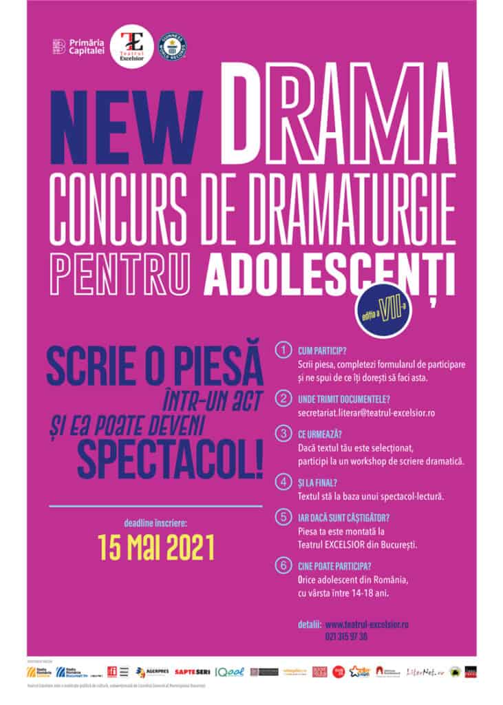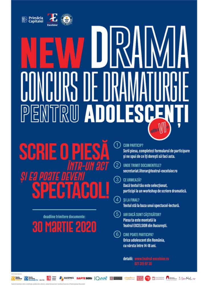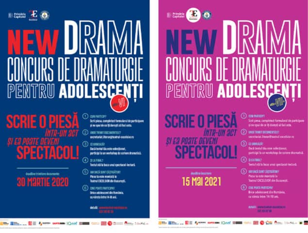 Teatrul EXCELSIOR prezintă sâmbătă, 17 decembrie, și duminică 18 decembrie 2022, spectacolele-lectură realizate pe baza textelor finaliste ale Concursului de dramaturgie pentru adolescenți NEW DRAMA,edițiile a VI-a și a VII-a, desfășurate în anii 2020 și 2021.
