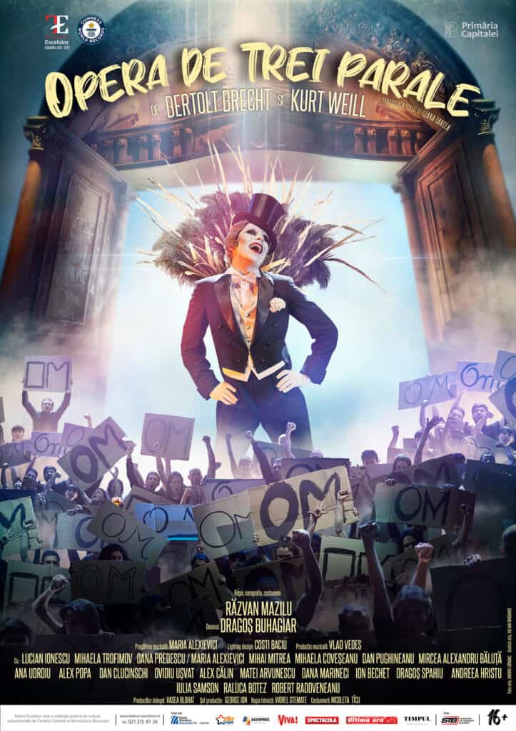 Spectacolul lumii urcă pe scenă și vi se dezvăluie electrizant, bulversant, imprevizibil (ca viața!) într-o creație scenică de o teatralitate cuceritoare, care îmbină grandoarea și decadența, sarcasmul și umorul, ludicul și luciditatea. „Opera de trei parale” este, în viziunea lui Răzvan Mazilu, un manifest – artistic și estetic – ce se îmbogățește ca rezonanță și semnificații prin pasiunea și energia creatoare ale tinerei trupe de actori a Teatrului EXCELSIOR, pe care o veți (re)descoperi într-o formulă extinsă.