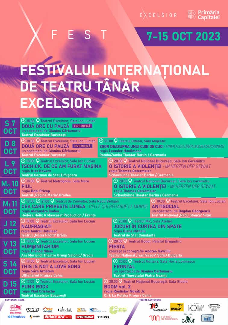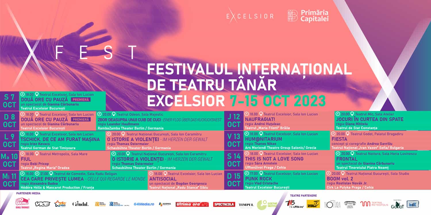 Teatrul EXCELSIOR va deschide seria spectacolelor din România cu o premieră absolută: DOUĂ ORE CU PAUZĂ, un spectacol de Gianina Cărbunariu, unul din cele mai importante nume ale regiei și dramaturgiei românești de azi. Noul ei spectacol abordează o temă extrem de sensibilă din istoria noastră recentă – educația instituționalizată. O odisee cool pentru tineri, spectacolul TSCHICK. De ce am furat mașina – regizat la Teatrul German de Stat din Timișoara de Irisz Kovacs – va spune povestea lui Maik și a lui Tschick, doi adolescenți care cred că trebuie să existe și o altă lume decât cea pe care o cunosc acasă și la școală. Teatrul „Regina Maria” din Oradea va prezenta spectacolul Fiul de Florian Zeller în regia lui Bobi Pricop, o dramă de familie care tratează într-un mod realist un subiect sensibil: depresia la adolescenți și suferința prin care trec toți cei care se confruntă cu o astfel de problemă. Antisocial, în regia lui Bogdan Georgescu, una dintre cele mai de succes producții cu și despre tineri ale Teatrului Național Radu Stanca din Sibiu, ne va oferi o perspectivă complexă asupra stării de fapt din școlile românești. Teatrul „Maria Filotti” Brăila va prezenta NAUFRAGIAT!Fantasticele aventuri ale lui Louis de Rougemont (povestite chiar de el însuși) de Donald Margulies, în regia lui Andrei Huțuleac. Jocuri în curtea din spate de Edna Mazya, spectacol regizat de Diana Mititelu la Teatrul de Stat Constanța, i-a adus tinerei regizoare Premiul pentru Debut la Gala UNITER din 2021 și este un spectacol despre cruzime, o radiografie a psihicului adolescentin. Teatrul Tineretului din Piatra Neamț aduce, în premieră pe scenele din București, FRONTAL – un spectacol de Gianina Cărbunariu, premiat în cadrul celei de-a XX-a ediții a Premiilor Radio România Cultural, la categoria „Teatru”. Teatrul EXCELSIOR va închide Festivalulcu spectacolul PUNK ROCK de Simon Stephens, în regia lui Vlad Cristache. Visceral, incisiv, bulversant, Punk Rock este o analiză dezarmant de sinceră a societății noastre, din perspectiva unor adolescenți aflați în pragul examenului maturității.